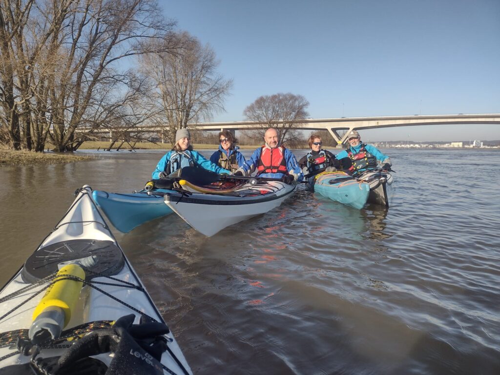 Een kleine twee weken later spreken we af in het clubhuis. Hoewel het water is gedaald tot 12 meter (bij Lobith), is het nog steeds een magisch uitzicht op de kop van de haven. Ik tref Arie uitkijkend over de stromingen en zich hardop afvragend of de dappere roeiers die tegen de stroom in varen richting de Pleijbrug nu veel harder gaan dan de kajakkers. Samen staan we gefascineerd te kijken. Want ja, het hoge water raakt ook mij. Al is het ‘maar’ doordat de uiterwaarden zijn omgetoverd tot enorme, gevarieerde watermassa’s.